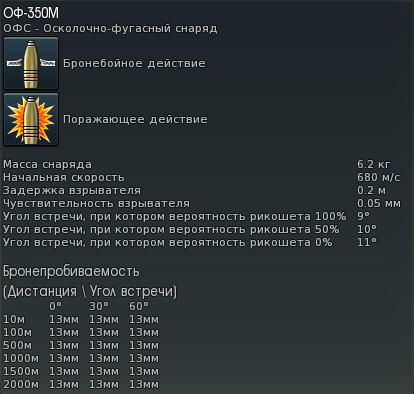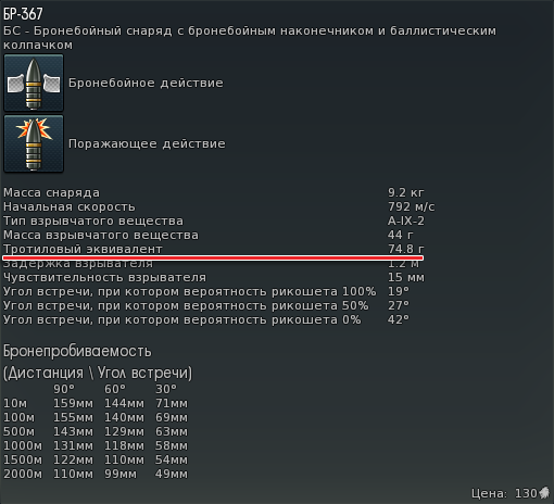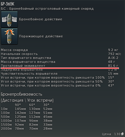 В патче 1.53 в карточке снаряда появились такие параметры как масса и тип взрывчатого вещества, а также масса взрывчатого вещества в тротиловом эквиваленте. Этот последний параметр нас с вами должен особенно интересовать, потому что именно от него зависит мощность каморного снаряда. Если есть выбор между несколькими снарядами, лучше брать тот, у которого взрывчатого вещества (в тротиловом эквиваленте) больше.